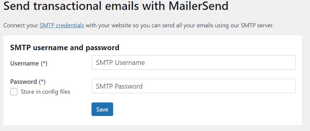 For the SMTP username and password fields, these would be the username and the password that are used with your MailerSend account.