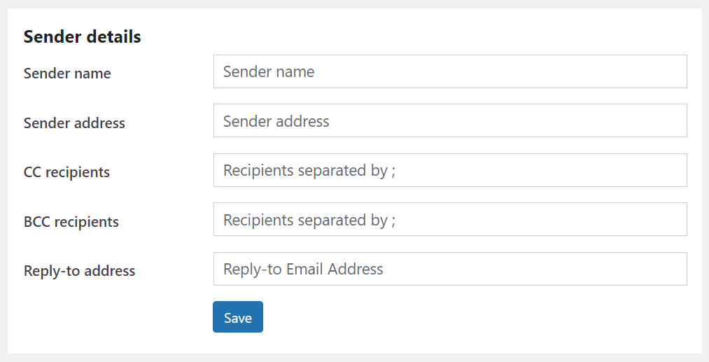 In these settings, you can set the sender name, sender address, and any other email addresses you want to include, using the CC recipients and BCC recipients fields, that you would also like to have your site emails sent to.