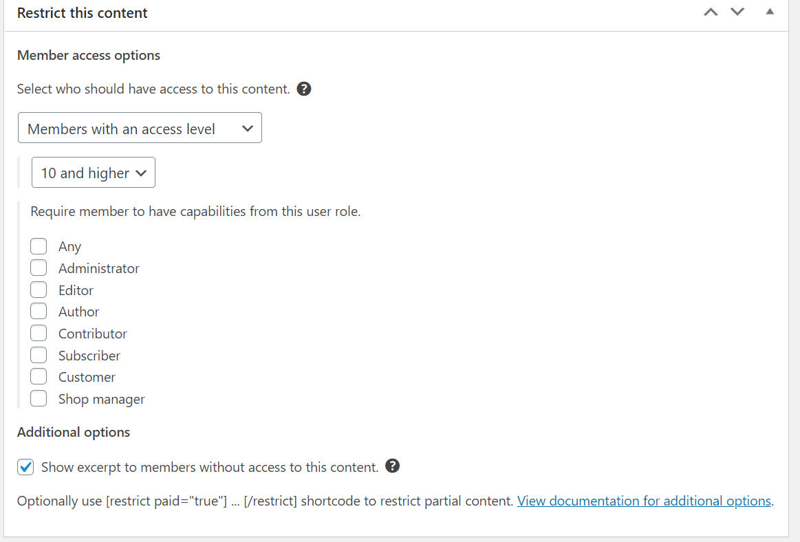 The last step will be to set which content you want to restrict for membership customers. Restrict Content Pro will work with post and page content as well as by categories. It is also possible to restrict specific sections of content as well.