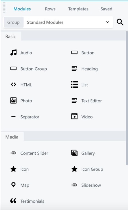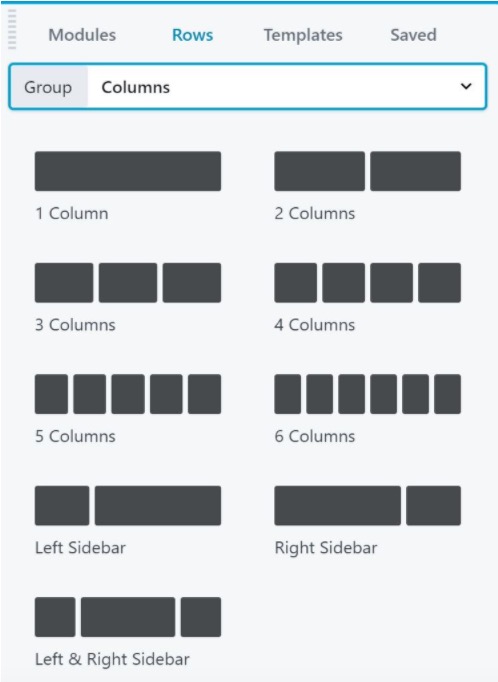 Start by placing a row of columns onto your content area. If you end up changing your mind on the amount of columns, no problem! You can always drag new ones into place. Now that your basic structure is in place, you can start adding some modules. There are lots of options to choose from: