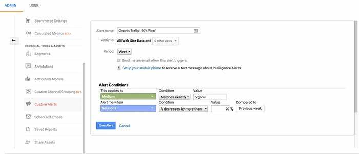 - Use Google Analytics custom alerts to alert you when your traffic decreases or increases substantially week on week;
