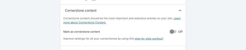 Look for a section labeled Cornerstone content near the bottom of the SEO panel. It should have a short description like “Mark as cornerstone content”.