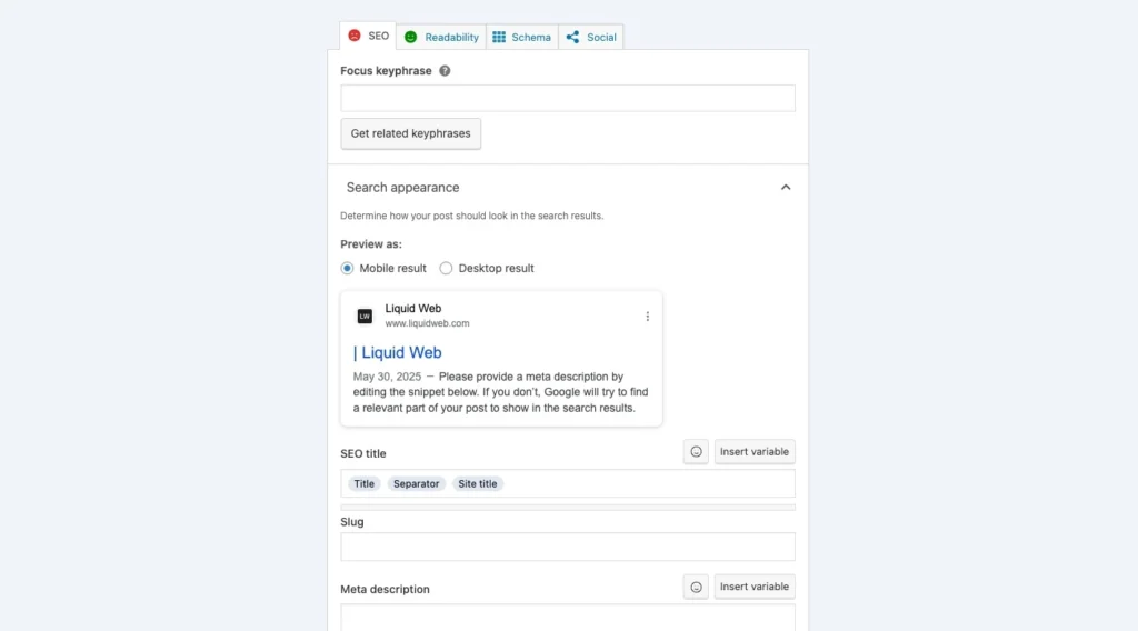 - Focus keyphrase: This field lets you specify the main keyword or phrase you’re targeting. Yoast uses it to evaluate how well your content is optimized.