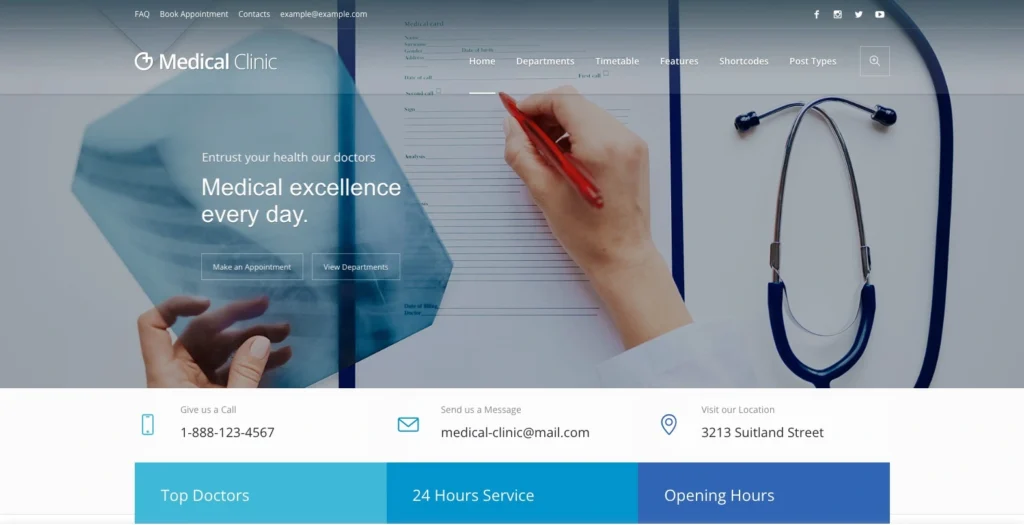 Medical Clinic is a comprehensive WordPress theme that includes advanced booking features and customizable service pages. It’s ideal for practices that need to showcase multiple doctors, departments, or specialties.
