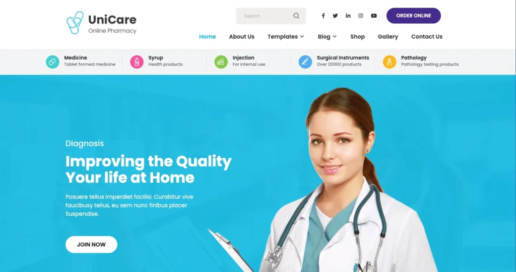 UniCare PRO is a versatile theme that works well for drug stores, pharmacies, and small clinics. It includes multiple page layouts for services, product displays, and doctor introductions, so you can quickly set up a professional website.