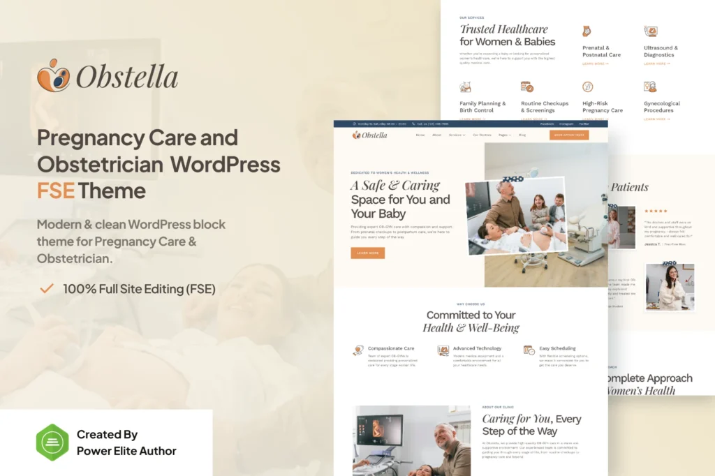 Obstella is designed with pregnancy care and obstetricians in mind. It features soft, welcoming colors and layouts that make expectant mothers feel comfortable navigating your site.