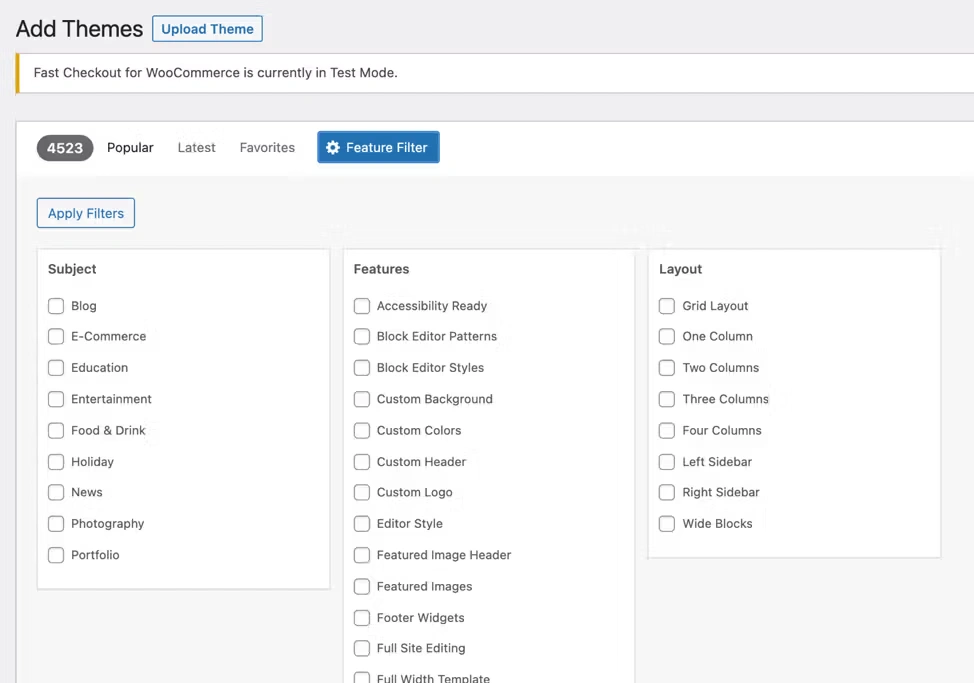 If you choose to use the “Feature Filter” option, you will be prompted with a list of theme filters to select from to whittle down your search, such as: