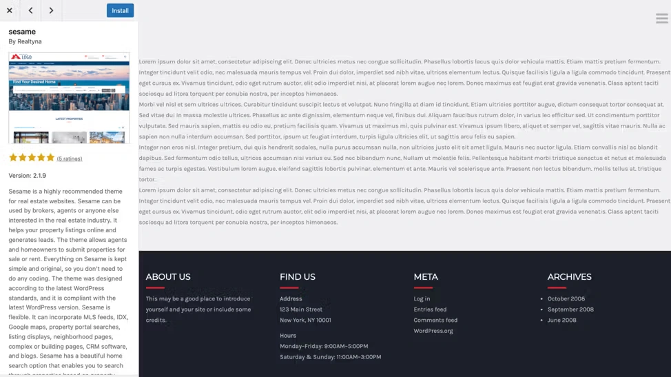 Once you find a theme you would like to install on your site, hover your cursor over the theme thumbnail. This will display the theme install and preview buttons, as well as a details button.