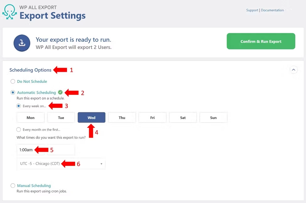 For example, to export WordPress Users every Wednesday at 1:00 a.m. Chicago time, you: