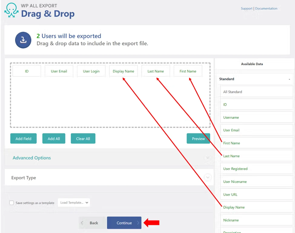The Drag & Drop interface allows you to select, arrange, and modify the fields for your user export: