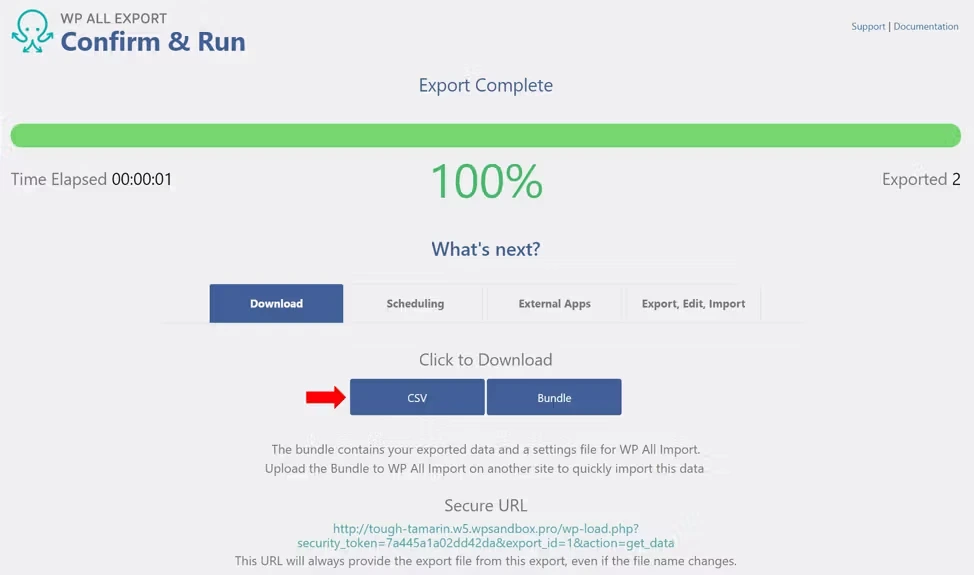 To complete your export, click the CSV button in the Click to Download section. This will download a CSV file to your local computer.