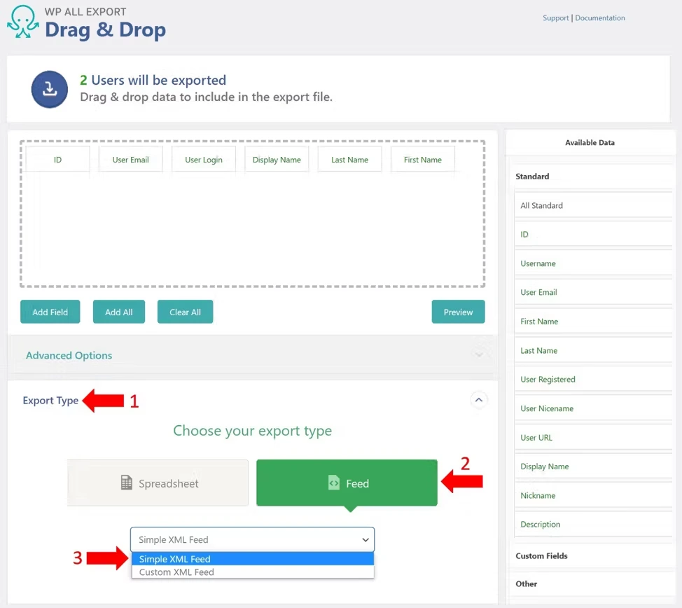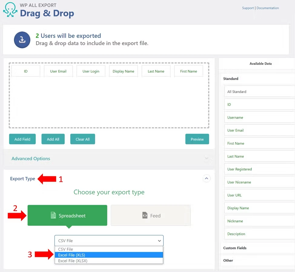 To export WordPress users in one of the Microsoft Excel file formats, do the following back in the Drag & Drop Interface: