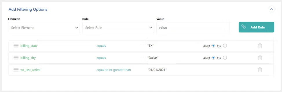 To apply multiple filters, just add more filter rules. For example, to select users from Dallas, Texas who have been active since January 01, 2021, you would set your filters as follows:
