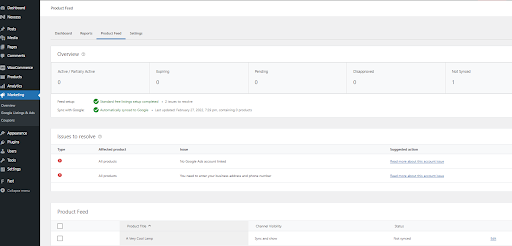 Once installed, you can immediately click on Activate, which will get you back on the plugin list. Next, you can either select Settings from the Plugins listing or navigate to Marketing > Google Listings & Ads. A WordPress.com account, Google Account, and Google Merchant Center Account will need to be linked for the plugin to work. If you run into any issues, the plugin will let you know what needs to be resolved and where to look to have the ads visible and synced with your Google Shopping-WooCommerce